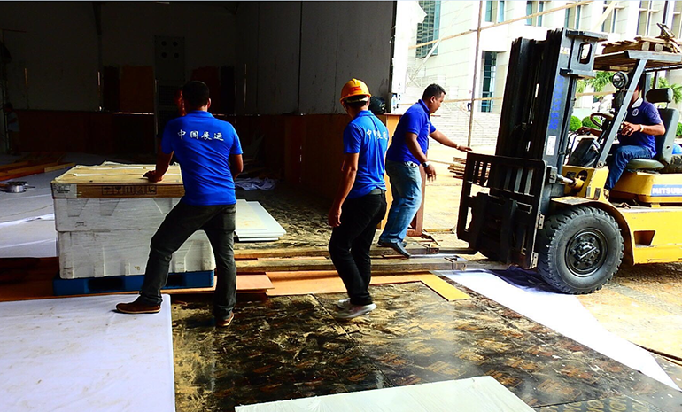 中国展运自12月22日接到任务起就严肃对待,丝毫不懈怠,作为一项政治任务来完成。由公司领导带头成立专门项目组,陪同贸促会促进部一起赴金边现场考察,根据现场的情况变化来提前准备各种运输预案,全公司上下齐心,全力支持,与时间赛跑。12月25日深夜完成第一批搭建材料的空运发货,并赶在元旦假期前实现所有展品分成四个批次的顺利发运,共计空运40吨展品和展览物资。