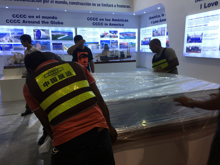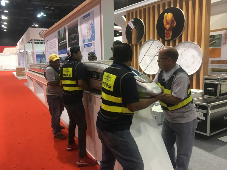 本届展会参展商多为国家知名的大型企业,有中国中铁、中国铁建、中国交通、中船重工、中国远洋、徐工集团、比亚迪等。他们非常重视此次展会,参展的展品多是代表国家和企业形象参加国家领导人出席的“高访展”展品,共计114件,海运来回程共计4个40尺集装箱,空运5吨,货值约500万元。不仅货值高,而且展品精细,品种和数量较多,有一定的安装难度。